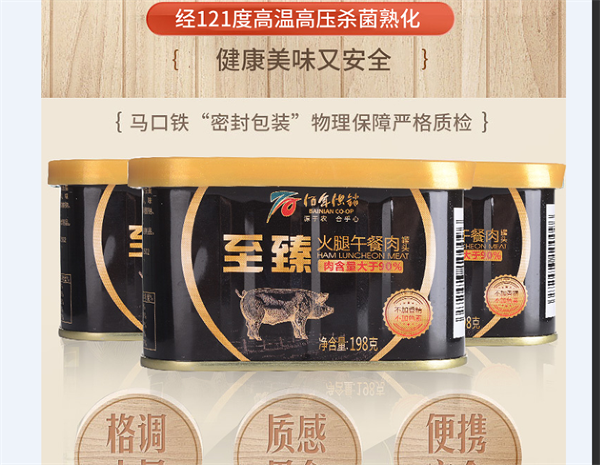 重慶市農產(chǎn)品集團食品科技有限公司生產(chǎn)的“佰年供銷(xiāo)”罐頭,包括午餐肉系列罐頭、紅燒豬肉罐頭、紅燒扣肉罐頭、紅燒牛肉、清蒸豬肉罐頭、豬肉雜醬和牛肉雜醬系列罐頭等20多個(gè)品種近50種規格。傳承古法罐裝優(yōu)勢,結合現有高科技設備,采用優(yōu)質(zhì)原材料、馬口鐵容器,經(jīng)歷金屬探測、人工挑選、真空斬拌及拌合、定量裝罐、抽真空封口、121℃以上高溫殺菌、X光機檢驗等多層工藝,基本不主動(dòng)添加防腐劑,向廣大客戶(hù)提供肉味濃郁、開(kāi)罐即食、保質(zhì)期長(cháng)的便利肉罐頭,是家用餐、旅行餐、野外餐必備良品。